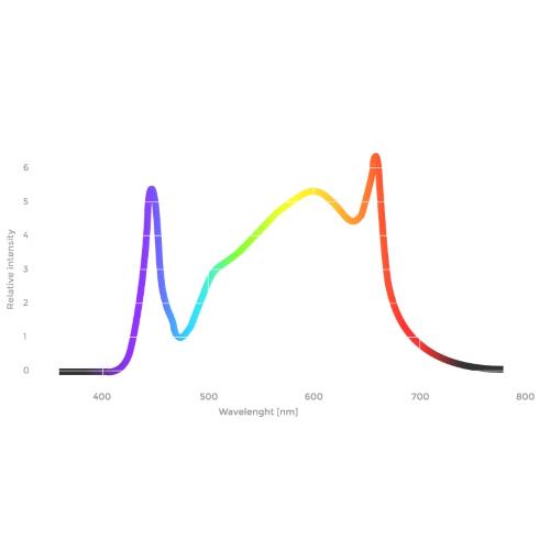 Broad spectrum. Lo spettro è stato pensato per applicazioni indoor, è formulato per coprire il ciclo completo di vita della pianta. Oltre al blu (430-460nm) e al rosso (630-660nm), l’ampio spettro è essenziale per la massima stimolazione di importanti pigmenti fotosensibili a diverse lunghezze d’onda.